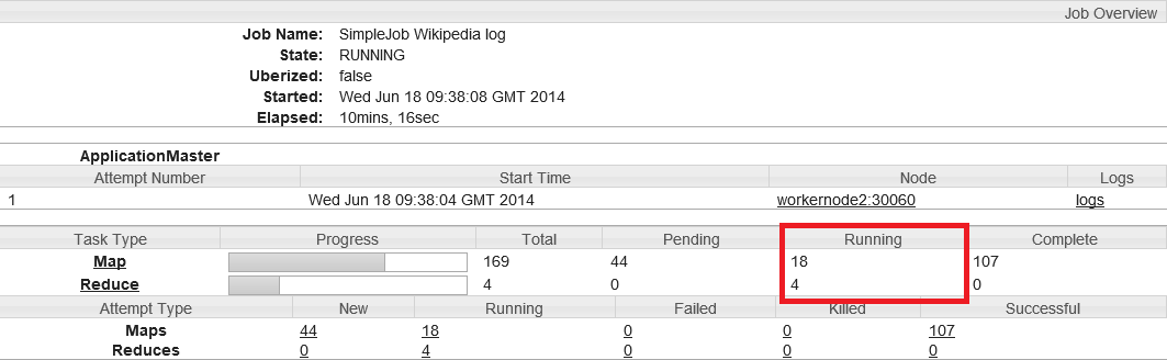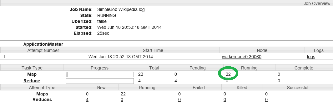 O cluster tem 4 máquinas e 24 núcleos, fazendo 23 « task containers » (24-1). Meu Job analisou 4 idiomas, por isso eu mudei o número de reducers para 4. Portanto, há apenas 19 containers para os mappers.