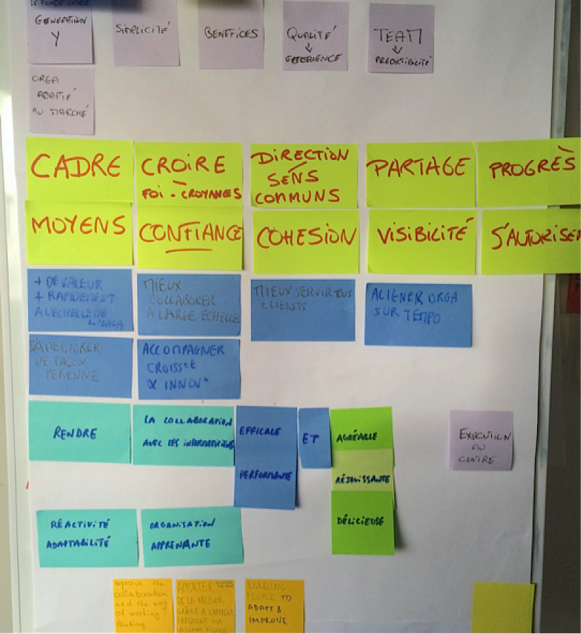 - Définir votre Pourquoi : donner aux participants 10 minutes pour réfléchir et écrire sur les notes adhésives le sens d’existence de son entité. Regrouper les notes et écrire le Pourquoi.