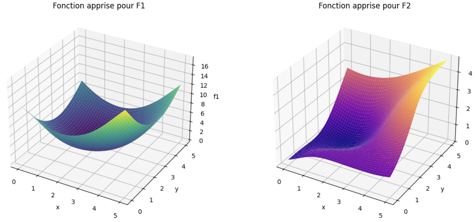 Enfin, vu que nous travaillons sur des données synthétiques en 3D, nous pouvons visualiser les fonctions apprises par le modèle en générant une grille de points et en les affichant. Nous faisons cela à titre purement pédagogique. Les processus que nous modélisons dans la vie réelle le sont rarement en moins de 3 dimensions.