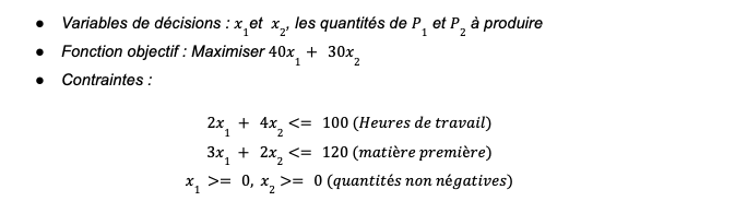 Une entreprise fabrique deux produits, P1 et P2. Chaque produit a un coût de production et un prix de vente. L'objectif est de maximiser le profit tout en respectant les contraintes de production.