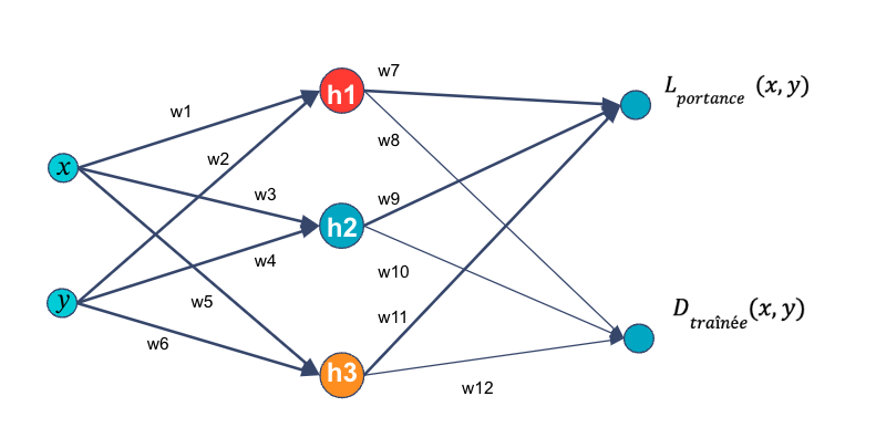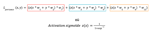 La formule suivante nous donne le calcul qui permet, à partir de x et y et du modèle, d’arriver aux valeurs de sortie Lportance(x,y) :