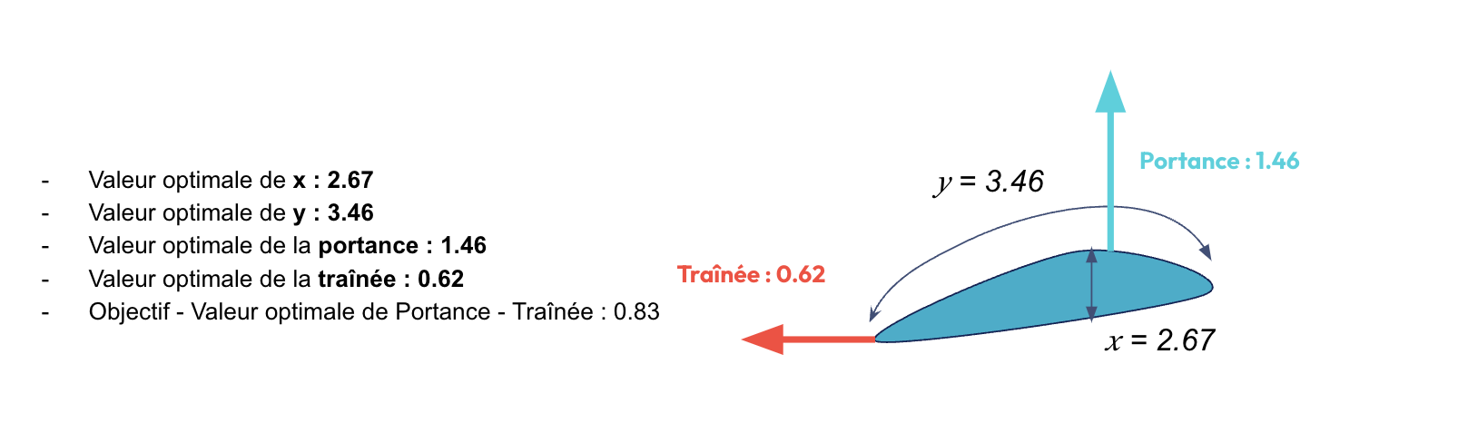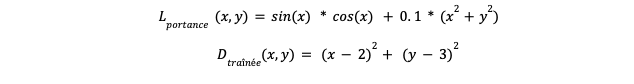 “Nous souhaitons trouver les valeurs optimales de la courbure y et l’épaisseur relative x d’une aile d’avions, maximisant sa portance, Lportance et minimisant la Dtraînée, x et y devant être dans une plage de valeurs acceptables”