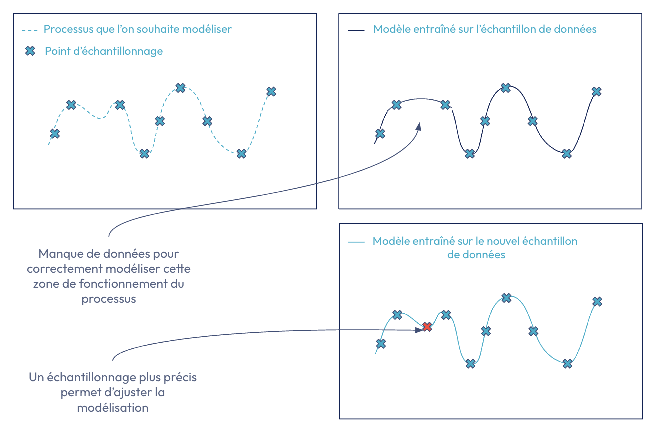 La figure ci-dessous nous rappelle l’importance d’avoir un jeu de données représentatif du processus que l’on souhaite modéliser. Dans le cas contraire, le modèle appris renverra des valeurs ne correspondant pas à la réalité. Dans notre optimisation, cela pourrait se traduire par des recommandations de valeur optimales fausses.