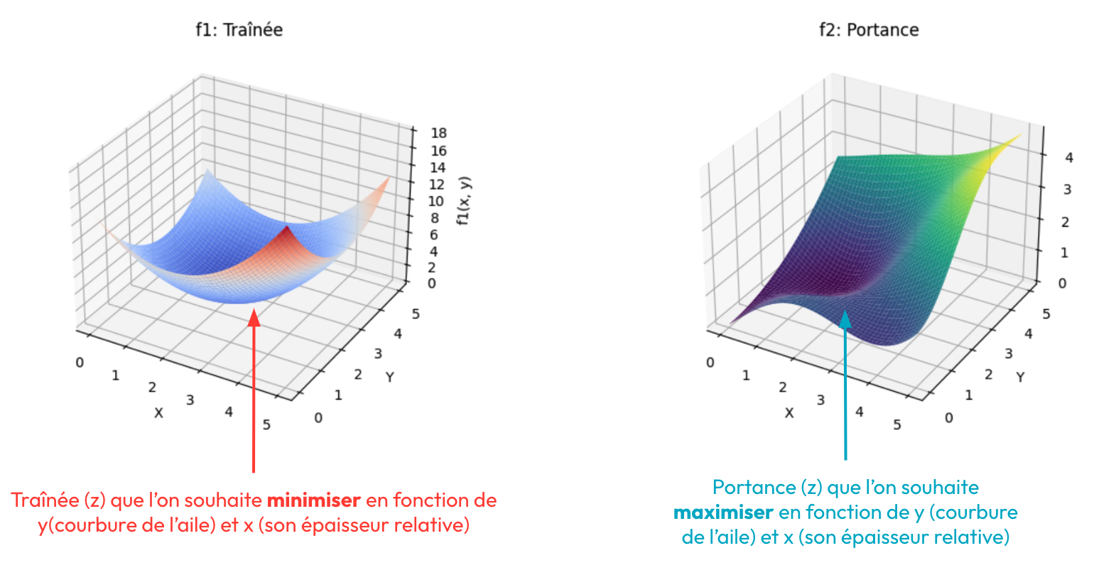 Dans ce contexte, la fonction f pourrait correspondre à la valeur de la portance d’une aile d’avion en fonction de sa courbure, représentée par x et de son épaisseur relative y. Une aile d’avion a plusieurs propriétés qui découlent de sa forme. Nous avons déjà la portance, mais lorsque nous faisons varier les paramètres x et y, cela impacte une autre propriété : la traînée. La portance améliore la capacité de charge et détermine la longueur minimale de la piste de décollage par exemple. Nous souhaitons la maximiser. À l’inverse, la traînée impacte la consommation de carburant et nous voulons donc la minimiser [4].