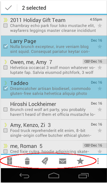 Si votre application utilise des onglets, positionnez-les en haut de l’écran, sous l’ActionBar et non en bas de l’écran, pour éviter de cliquer sur les boutons systèmes :