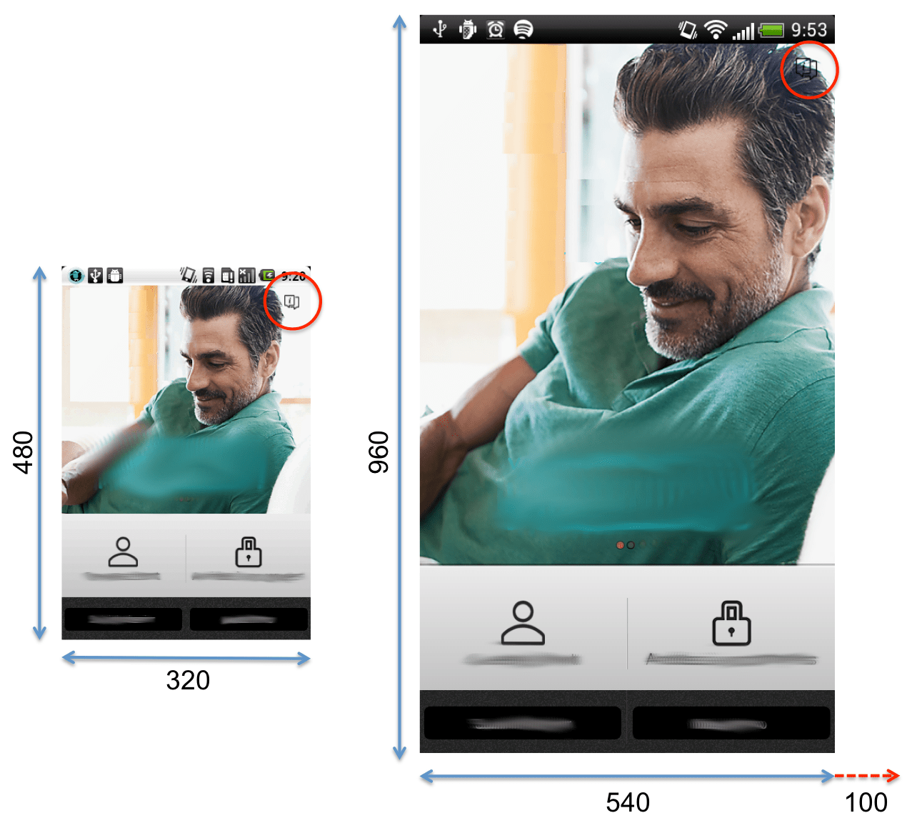 Sur iPhone, il ya 2 résolutions proportionnelles (3 maintenant avec l’iPhone 5) : 320x480 et 640x960 avec 2 densités de pixels. Sur Android, il y en a des centaines de résolutions (non proportionnelles) et 5 densités de pixels ! On se retrouve donc avec des terminaux plus ou moins carrés ou rectangulaires et de tailles différentes.