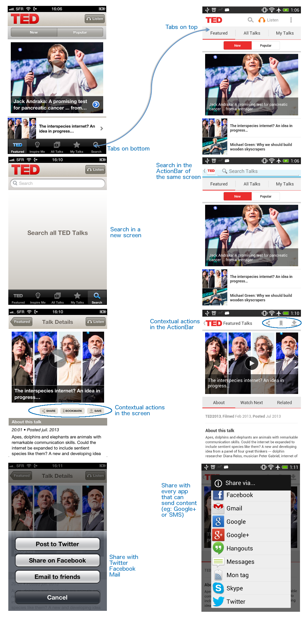 Ci-dessous, l'exemple de quelques écrans de l'application TED. Même si le contenu est identique, chacune respecte les guidelines de sa plateforme (cliquez pour agrandir) :