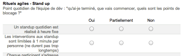 La forme de la checklist peut également être adaptée. Dans le but de la communiquer facilement à nos équipes et de centraliser ses résultats, nous en avons fait un formulaire Google. Nous avons également modifié sa forme pour éliminer la frustration du "tout ou rien" en ajoutant un choix de réponse intermédiaire. Cette réponse permet de préciser qu'un effort est réalisé mais que la pratique n'est pas totalement maitrisée/appliquée.