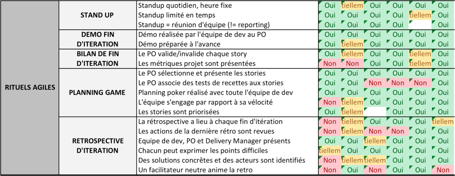 Au delà de savoir si nos projets étaient agiles, notre volonté était d'améliorer nos pratiques. Et pour améliorer, il faut mesurer. D'où l'idée de lister les points de méthodes appliquables concrètement dans nos missions.