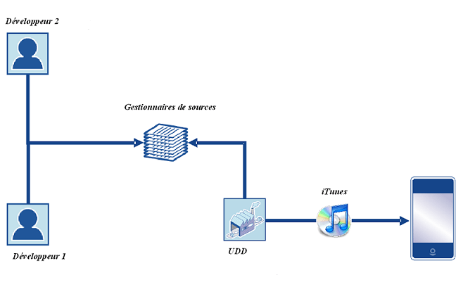 La mise en place d’une usine de développement permet la distinction entre l’environnement de développement (le mac de chaque développeur), l’environnement d’intégration (un mac sur lequel tourne l’UDD) et l’environnement de recette (le poste mac ou PC, sur lequel on dépose l’application qui est transférée dans iTunes).