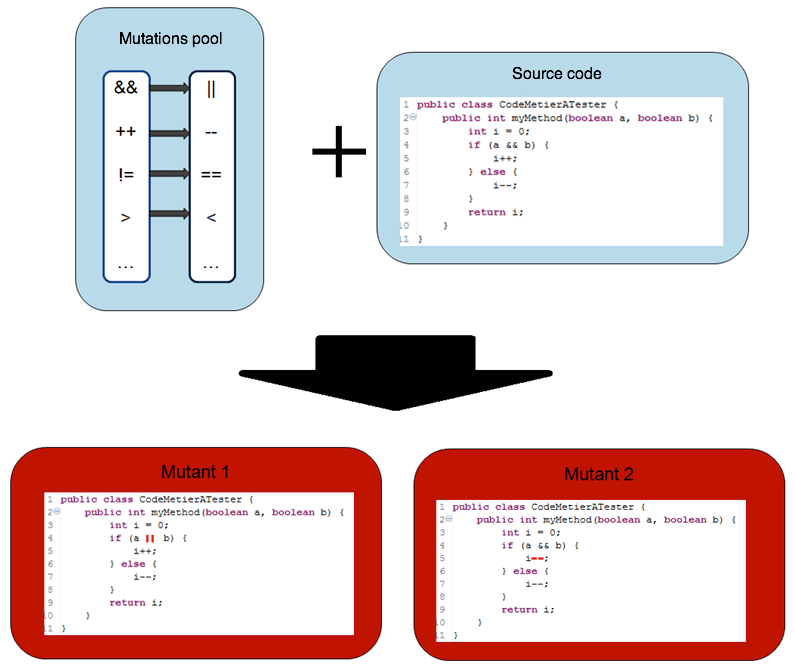 Next, a pool of mutations. A mutation is a change in source code. For example, the switch of an operator. Here are some examples: