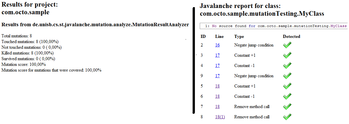 Dans la section de gauche, on observera que cette simple classe génère déjà 8 mutants, mais surtout qu'il y a 3 survivants. Dans la partie de droite, on remarquera que c'est au niveau de la ligne 18 que le bât blesse.