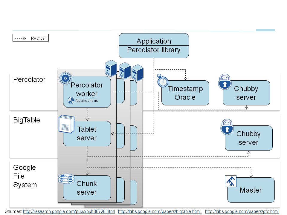 - Google Percolator Research paper:“Large-scale Incremental Processing Using Distributed Transactions and Notifications”, Daniel Peng, Frank Dabek, Proceedings of the 9th USENIX Symposium on Operating Systems Design and Implementation, 2010.