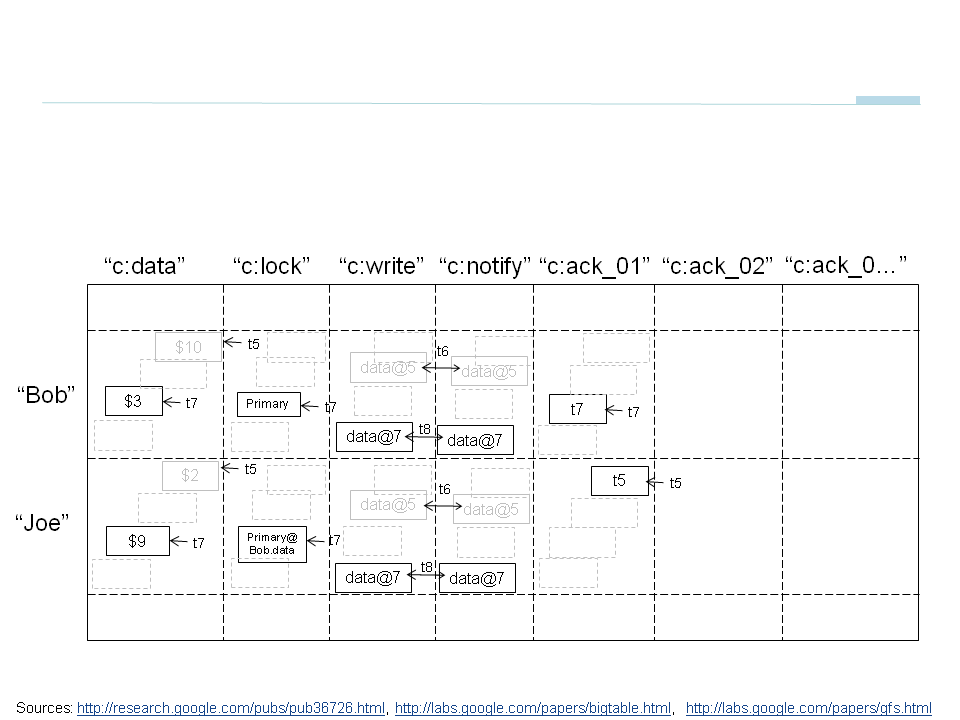 Percolator uses metadata columns in BigTable: for transactions c:data, c:lock and c:write. The high level synopsis for writing it is the following: