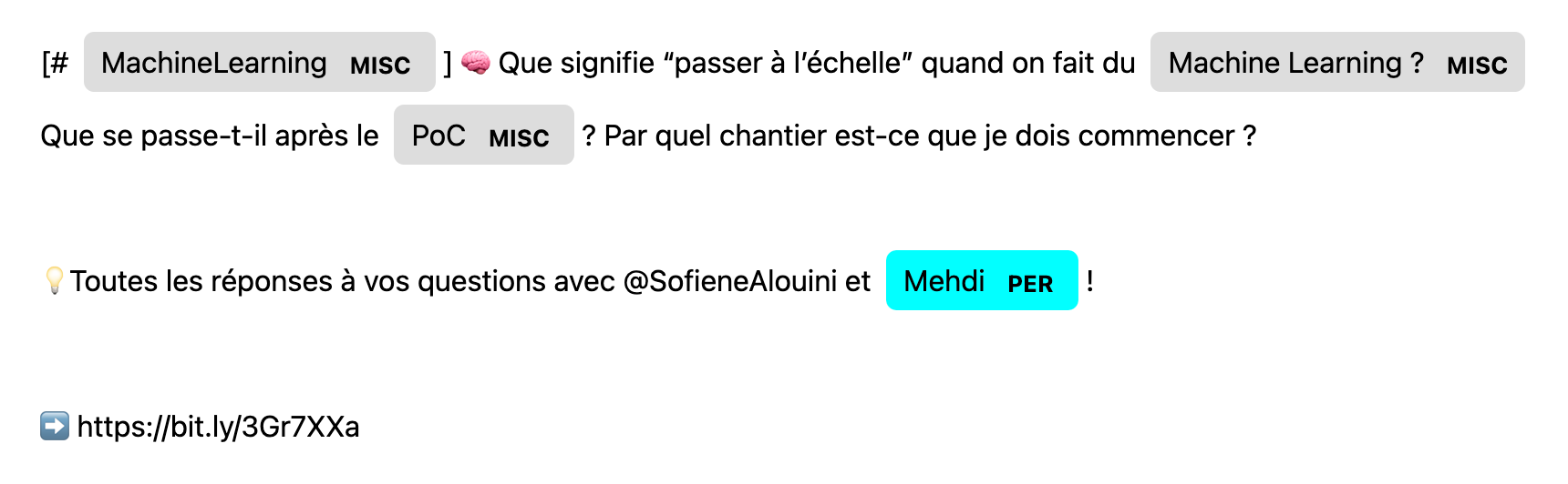 >>> text_1 = """[#MachineLearning] 🧠 Que signifie “passer à l’échelle” quand on fait du Machine Learning ? Que se passe-t-il après le PoC ? Par quel chantier est-ce que je dois commencer ?