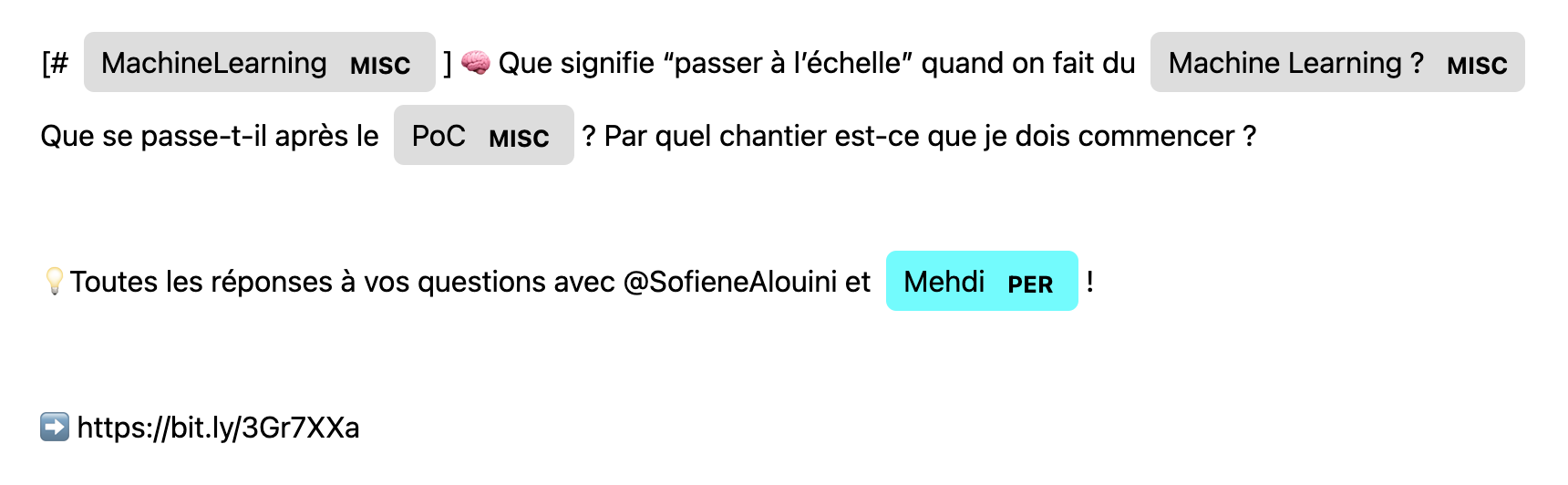 <br>>>> text = """[#MachineLearning] 🧠 Que signifie “passer à l’échelle” quand on fait du Machine Learning ? Que se passe-t-il après le PoC ? Par quel chantier est-ce que je dois commencer ?<br> <br>💡Toutes les réponses à vos questions avec @SofieneAlouini et Mehdi ! <br> <br>➡️ https://bit.ly/3Gr7XXa"""<br>