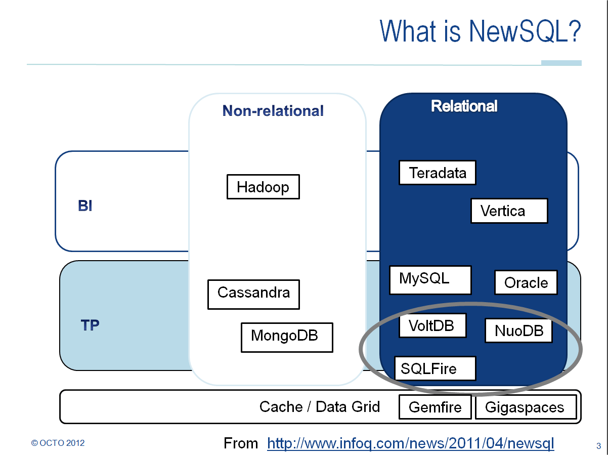 Ce schéma - librement adapté de la version originale de InfoQ - montre que NewSQL est né de la rencontre de 3 types d'architecture : relationnelle, NoSQL et grille de données (ou cache distribué).