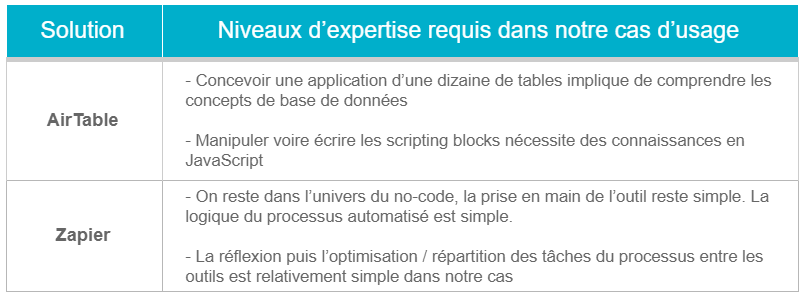 En termes de compétences et ce dès la conception, développer une application de gestion sous AirTable fera appel à des notions élémentaires de conception, d’architecture, ou de langage informatique. Le niveau reste toutefois modeste et nous conseillerions de ne pas rechigner à investir quelques jours en prestation si vous ne disposez pas de ressources en interne. C’est un investissement modeste qui vous fera partir du bon pied et vous fera monter en compétence par la même occasion. Dans notre cas un profil idéal serait un informaticien sachant modéliser les tables / objets d’une petite application (<10 tables) et ayant quelques connaissance en JavaScript. La prise en main d’AirTable (Zapier) et la montée en compétence sur l’outil n’étant pas un frein pour nous. Connaître ces 2 outils est toutefois un plus.