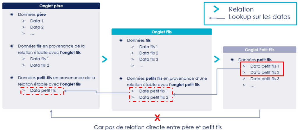 - AirTable est structuré en ‘Onglet’ qui s'appuie sur des notions de tables + relations & vues (données venant d'autres tables). On arrive vite à avoir besoin de faire de nombreuses imbrications en cascade d'onglets ("vue dans des vues") en mode poupées russes. En établissant une relation entre deux onglets (père & fils), on hérite bien des champs de l'onglet fils, mais on ne peut rajouter des champs du 3e niveau - petit fils qui ne seraient déjà hérités au niveau du fils (voir schéma ci-dessous). La jointure ne peut se faire que sur un seul niveau.