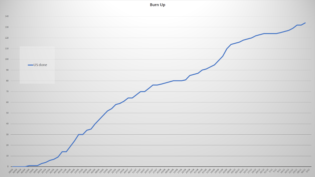 Ci-dessous notre burn-up chart de début Avril (Itération 0) à début Décembre 2017.