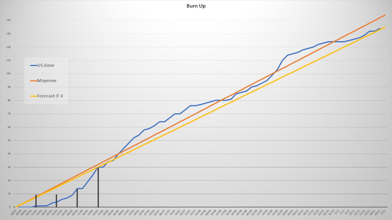 Dès le commencement du projet, nous avons décidé que la métrique qui permettrait de suivre l’avancement de nos développements serait l’US (User Story) : Nous n’estimerons pas ces US et ne compterons pas de points de complexité, de Jours-Hommes, de tailles de T-shirt ou autre ; nous compterons seulement les US terminées (Done : dans notre cas, déployées sur l'environnement de production).