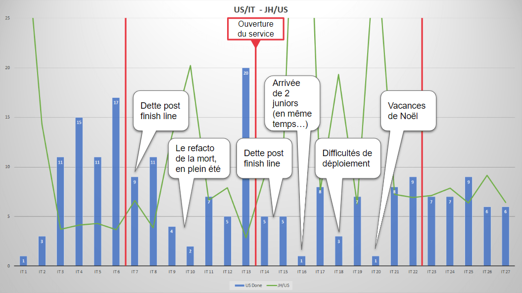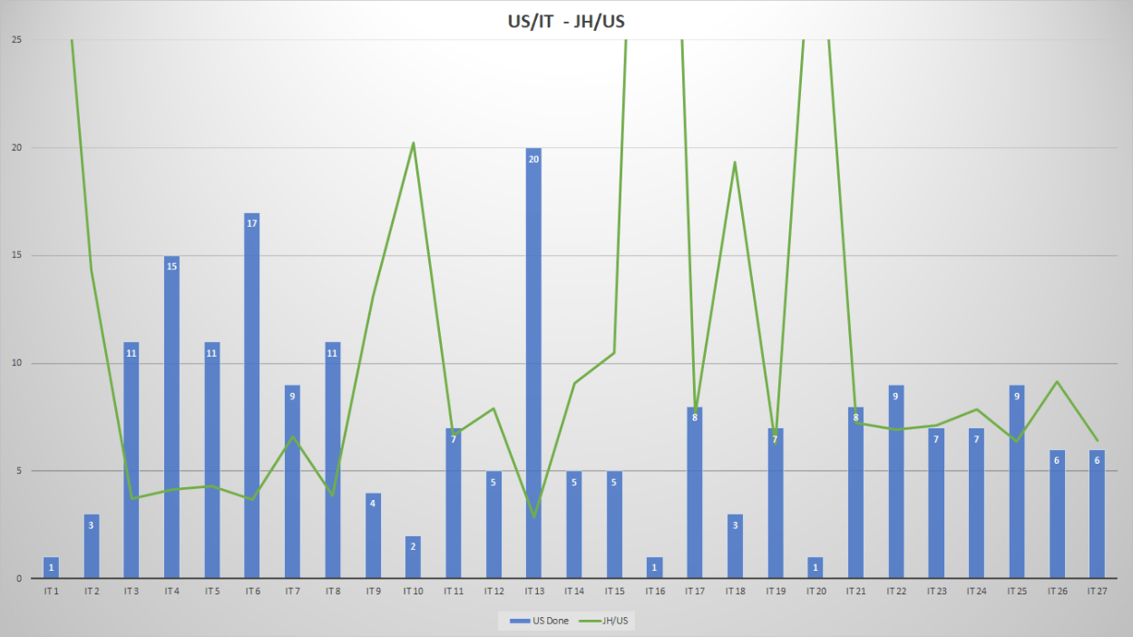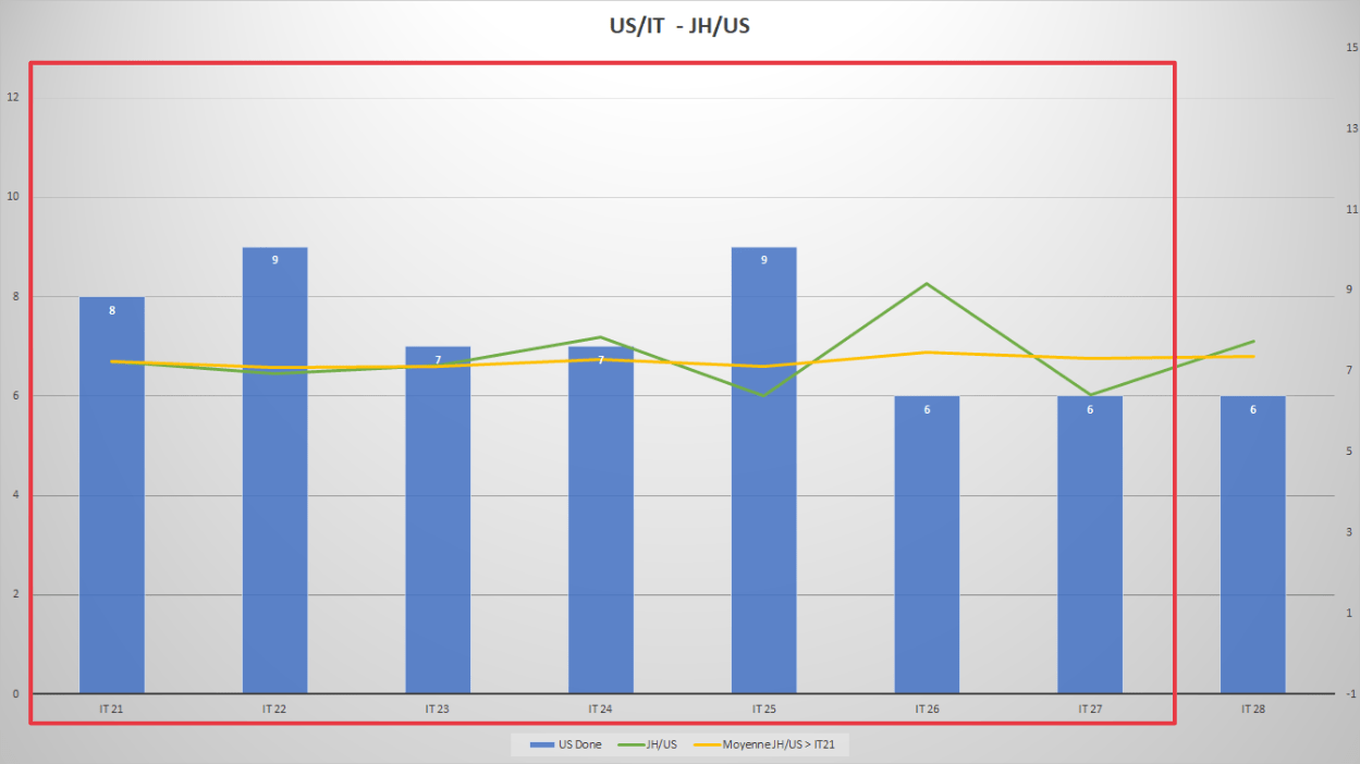 Afin de pouvoir comparer plus justement nos itérations les unes aux autres, nous avons choisi d’introduire dans nos métriques la notion d’ETP (Equivalent Temps Plein, exprimés en Jours-Hommes - JH) disponibles sur la période. Utilisant cette notion, nous avons construit un indicateur simple : le nombre d’ETP moyen nécessaire à la production de chaque US livrée - soit le nombre de Jours-Hommes disponibles sur la période divisé par le nombre d’US livrées - et nous avons ajouté cette courbe au graphique.