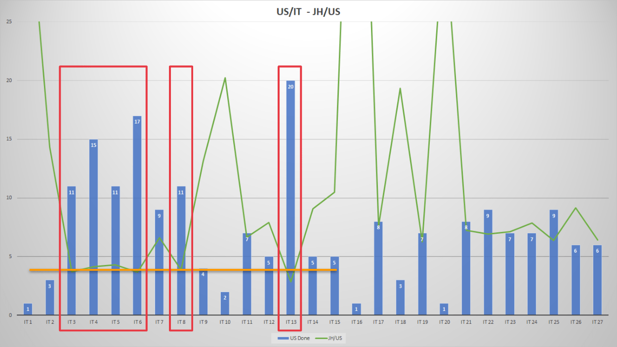 Recourir à cette métrique nous permet de rendre comparables les itérations entre elles. Par exemple, nous pouvons constater que les itérations 3, 4, 5, 6, 8 et même 13, sont très similaires malgré un nombre d’US livrées pouvant varier du simple au double.