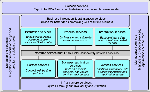Another perception of SOA is to consider everything as a service in any architecture layer: business services, logical services, IS services, technical services, web services, infrastructure services. Improper use of the word service is all the most disturbing, that it is already used to define many aspects of IT: IT services, IT transformation services, outsourcing services, consulting services, etc. Many software vendors and consulting companies define their SOA reference architecture similar to the following: