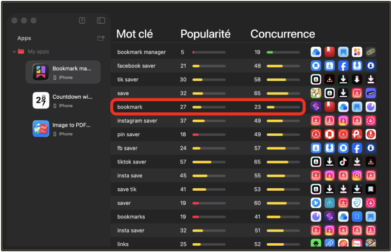 Il croise popularité (volume de recherches) et concurrence (nombre d'apps positionnées) pour chaque mot-clé. Un mot-clé populaire avec peu de concurrence est un signal fort. Exemple : "Bookmark” affiche 27 % de popularité pour 23 % de concurrence, c'est un green flag. "Fave" (popularité 100, concurrence 65) est bien plus risqué.