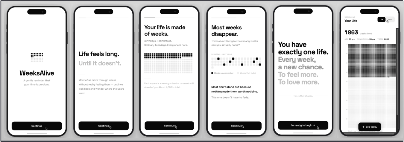 Il illustre ce processus avec son application "La grille de la vie" (une visualisation de vie sous forme de grille semaine par semaine). L'IA génère une interface minimaliste et émotionnelle, avec une accroche qu'”[Adrien] n'aurait jamais écrit seul” :