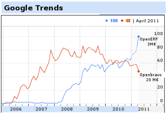 OpenERP c'est 185 employés en Belgique, Inde et États-Unis, 200% de croissance en 2011, 32% du budget  investi dans la R&D, environ 1 000 installations par jours et plus de 1 000 modules développés. 2010 a été pour la société OpenERP l'année d'une transition dans le business model. La société a arrêté ses activités de conseil et d'intégration et est passée à un statut d'éditeur. L'accent va donc être mis sur le développement du réseau de partenaires et leur accompagnement. On compte aujourd'hui plus de 300 partenaires dans 60 pays. Et d'après les tendances de recherche google, OpenERP passerait devant ses principaux concurrents opensource en termes de visibilité tout en ayant levé moins de fonds :
