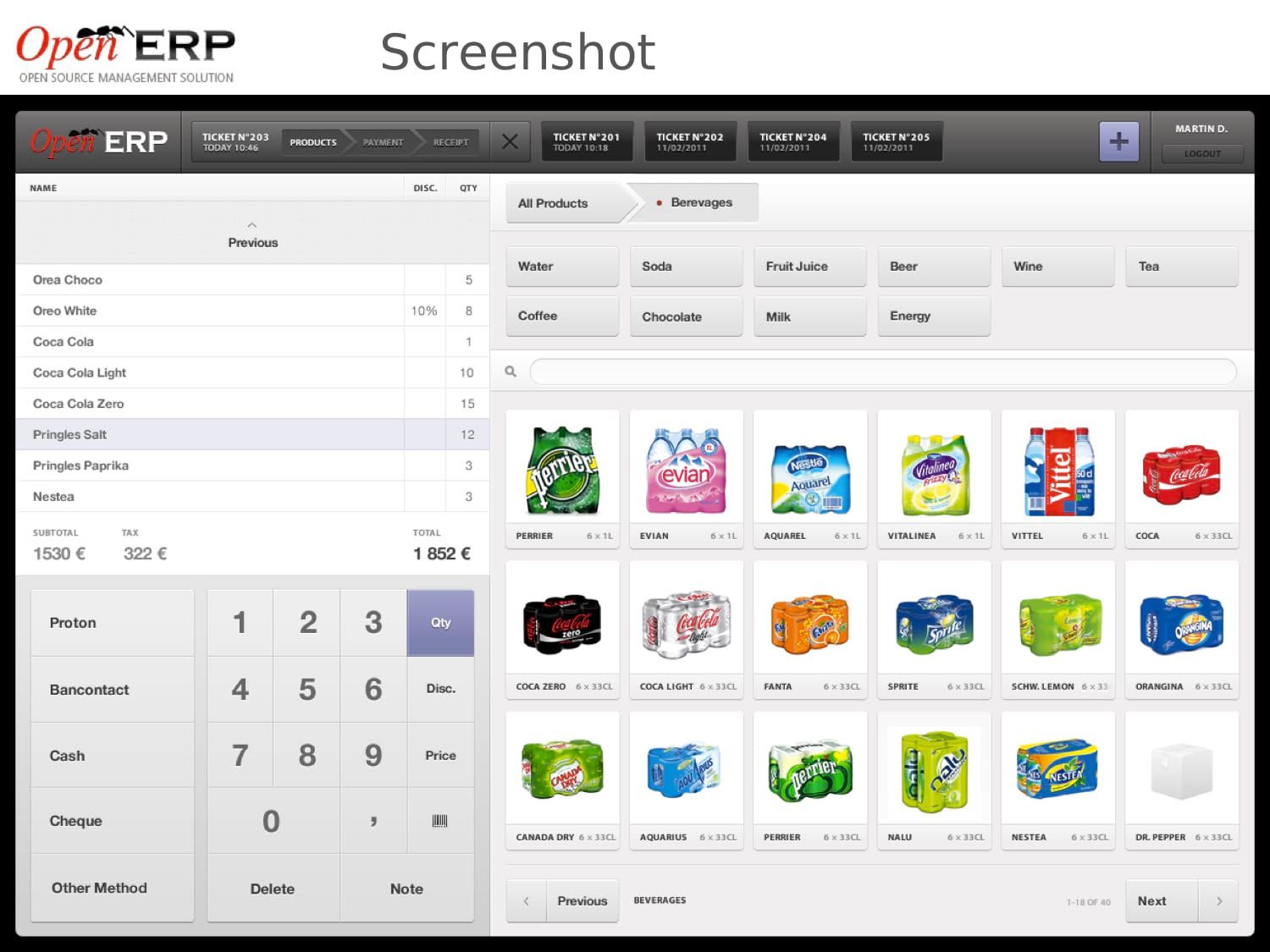 • Point de vente (POS : Point Of Sale) : une nouveau client web  pour les terminaux tactiles de vente est en cours de développement (lp:~openerp-dev/openobject-client-web/trunk-proto61-pos). Il pourra fonctionner en mode déconnecté et stockera ses données directement dans la base de donnée du navigateur. Même s'il semble prometteur, ce nouveau client pose déjà quelques problèmes de sécurité et d'intégrité des données. Il est tout de même bon de préciser qu'il ne s'agit que d'un prototype et non de la version finale à laquelle des améliorations seront apportées.