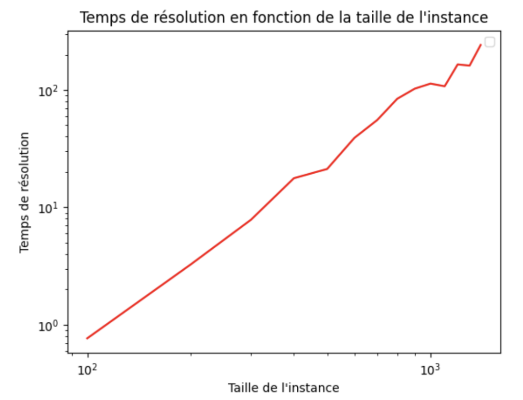 -Note : Dans la figure 1, je mesure le temps de résolution de plusieurs instances de TSP. Entre chaque deux mesures successives, nous gardons la même instance et nous lui rajoutons 100 positions à visiter. Comme la composition par le logarithme nous permet d’inverser la fonction exponentielle, le comportement linéaire du tracé du temps de résolution en échelle logarithmique nous permet de conclure qu’il a un comportement exponentiel.-