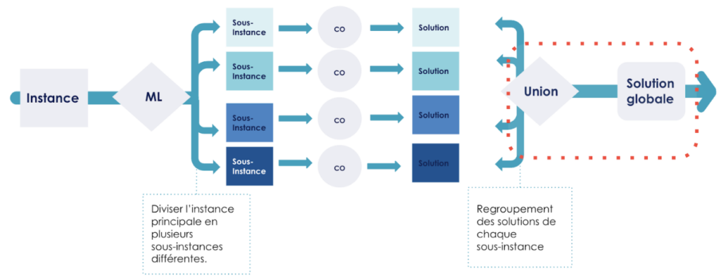 Ainsi, le but de mes recherches est de concevoir un algorithme innovant intégrant des techniques issues des deux domaines, optimisation combinatoire et Machine Learning, pour résoudre un problème à grande échelle.