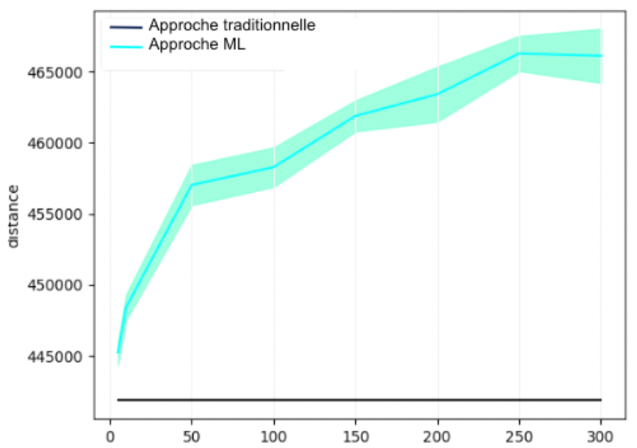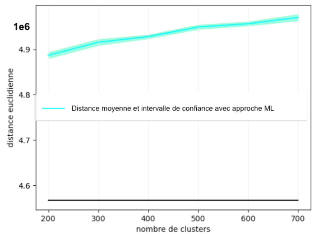 Nous pouvons constater que l'approche traditionnelle reste nettement plus performante que l'approche avec Machine Learning. Néanmoins, pour un petit nombre de clusters (<10), la perte en performance ne dépasse pas 5%. Plus intéressant encore, pour 5 clusters, la perte en performance avec l'approche ML est de 1%.