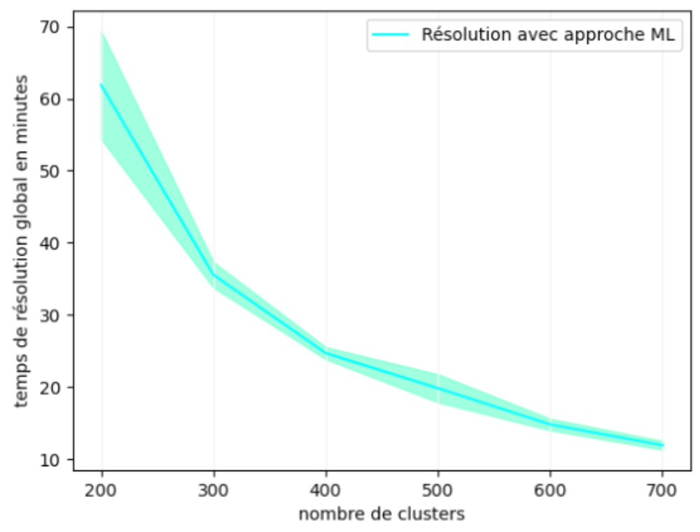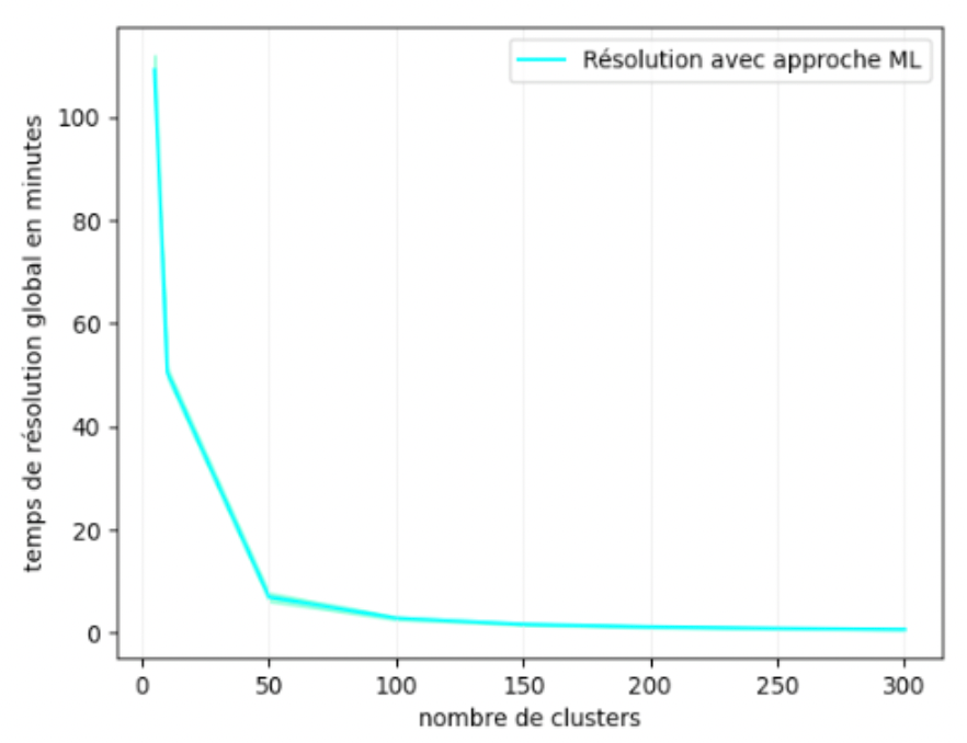 Face à ce problème, j'ai essayé de comparer les deux approches sous un autre angle : limiter le temps de recherche en profondeur à une heure et de baser ma comparaison sur la solution intermédiaire qui sera fournie par l'approche traditionnelle. Après 8h de calcul, l'exécution du programme s'achève sans fournir aucune solution intermédiaire. De plus, le temps de modélisation avec l'approche traditionnelle à lui seul s'élève à 69 minutes. Ce temps dépasse le temps de résolution total avec l'approche ML sur 200 clusters qui se situe autour de 61 minutes en moyenne.