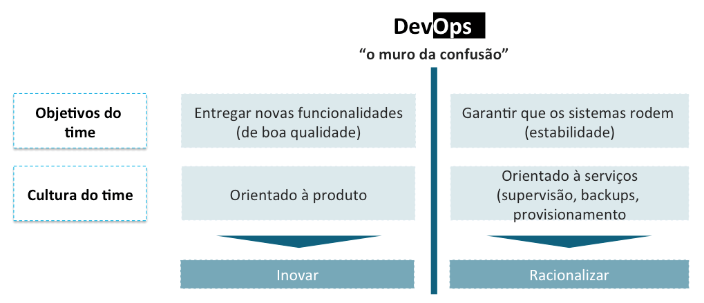É importante notar que, apesar de cuidarem do mesmo produto, as equipes de desenvolvimento e operações jogam em times diferentes: tem objetivos e culturas distintas, e até mesmo opostas.