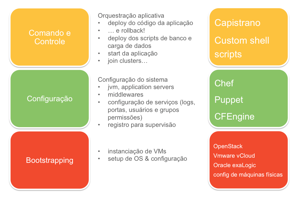 Essas ferramentas permitem a codificação da infraestrutura, como por exemplo instalação e iniciação de um serviços http, servidor Tomcat, criação de pastas para logs, etc.