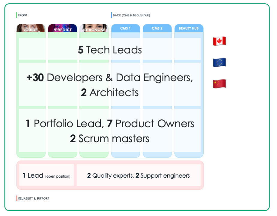 L'approche organisationnelle choisie par L'Oréal consiste à créer des "verticales" par domaine (make up, hair, fragra, ce, etc) composé de l’équipe de dév, d’un PO et d’un tech lead qui va assurer la gestion des dépendances avec les autres domaines.