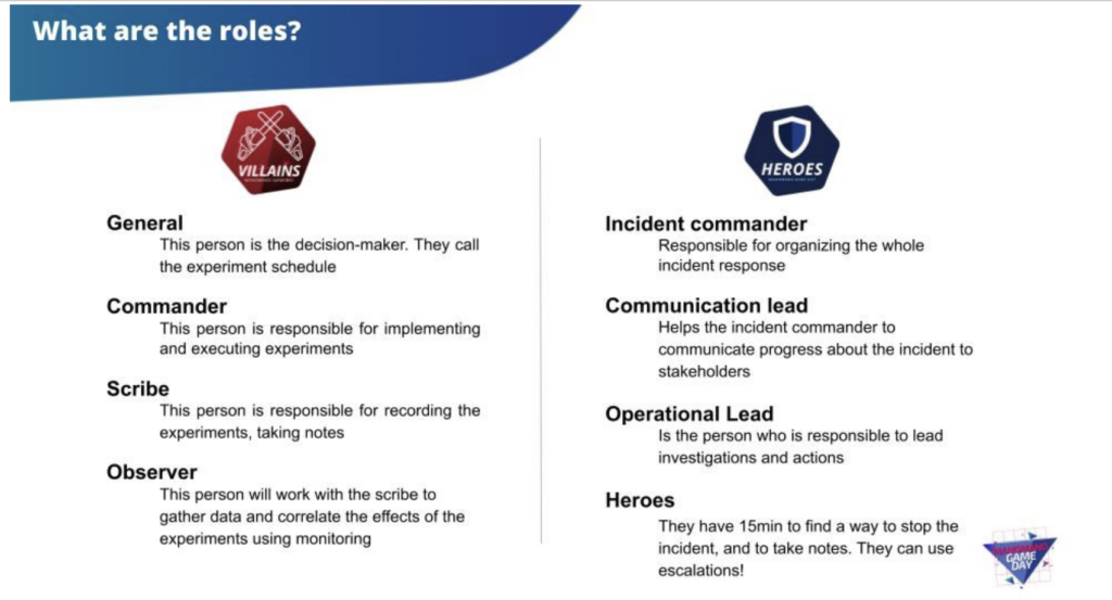 Les participants à ce Game Day avaient deux rôles différents: les vilains (ils gèrent la mise en place des incidents) et les héros (ils doivent résoudre les incidents mis en place par les vilains).