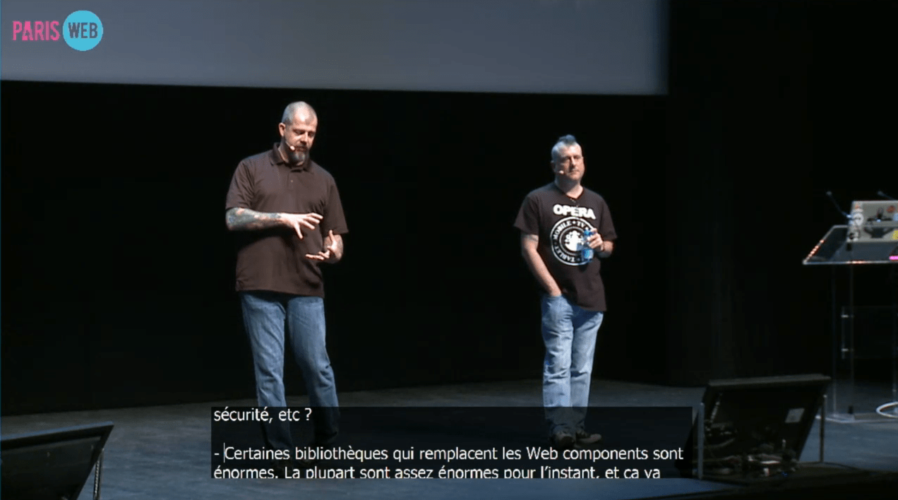 À côté, la question se pose sur les Web components. Lors de leur conférence, Bruce Lawson d'Opera Software (la navigateur) et Karl Groves , expert accessibilité chez Paciello Group, ont insisté sur le fait que l'utilisation du Shadow DOM (utilisé pour encapsuler un composant) est un problème pour enrichir un composant existant : vous ne pouvez pas ajouter d'événements sur la modification d'un morceau du composant. Or c'est justement ce que PayPal a fait avec Bootstrap. On se reposera alors uniquement sur la qualité du composant lui-même, ce qui pose la question de la qualité du travail communautaire. La conclusion de leur conférence : de la passion, oui, mais avec des pull requests !