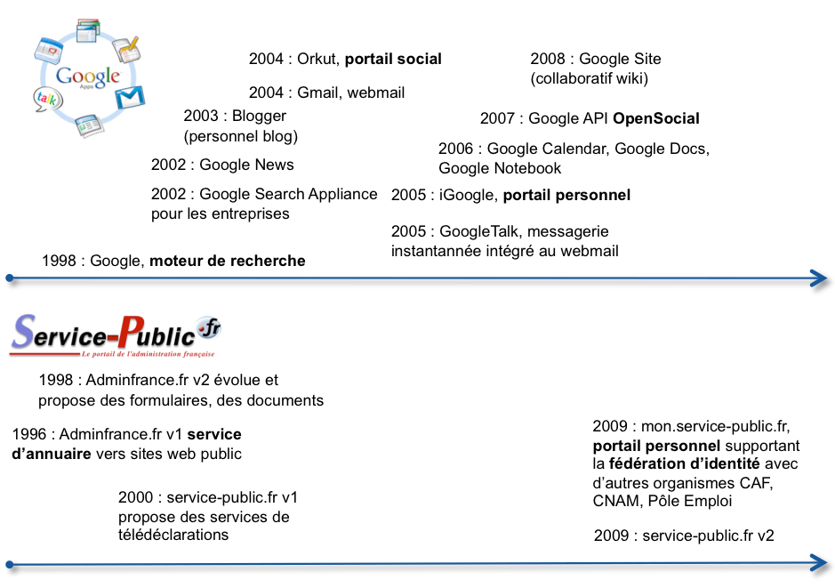 Ces dernières années, les sites ont évolués pour proposer toujours plus de services aux utilisateurs notamment avec la tendance des utilisateurs à toujours plus de collaboratif et de social. Ce faisant, chaque jour, plus de sites deviennent des portails. Retraçons par exemple les évolutions de deux acteurs très différents : Google et le site de l'administration française au travers d'une frise chronologique.