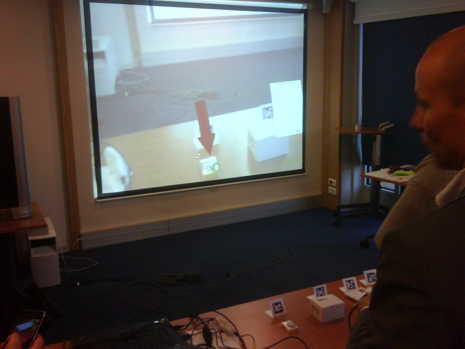 When "seeing" markers the system inserts virtual images to guide the picking (during the demonstration the image was displayed on the screen for everyone to see). The item the camera is showing is the small box with a marker on the left hand side of the table, an arrow hovers over it to indicate this is the item to pick.