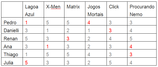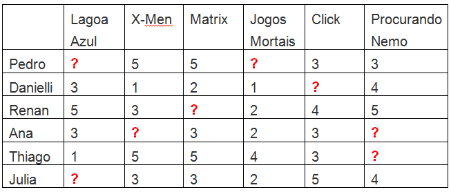 Dessa maneira, mais do que dizer que Pedro iria gostar de “Jogos Mortais” e a Julia iria adorar “A Lagoa Azul”, saberíamos que a Ana detestaria “X-men”.