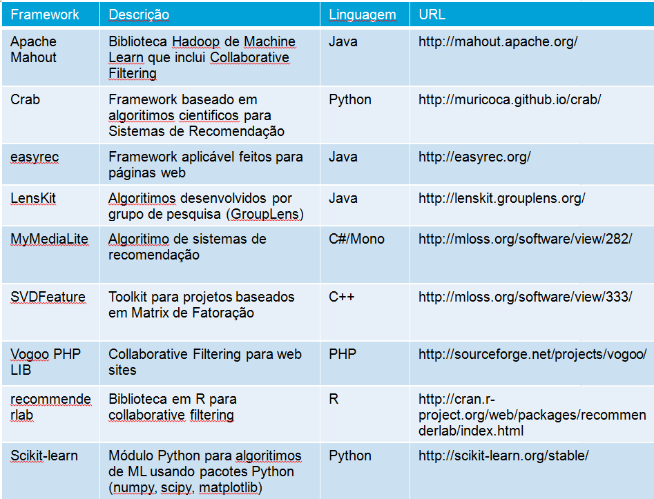 Na tabela abaixo temos uma lista com alguns frameworks de sistemas de recomendação:
