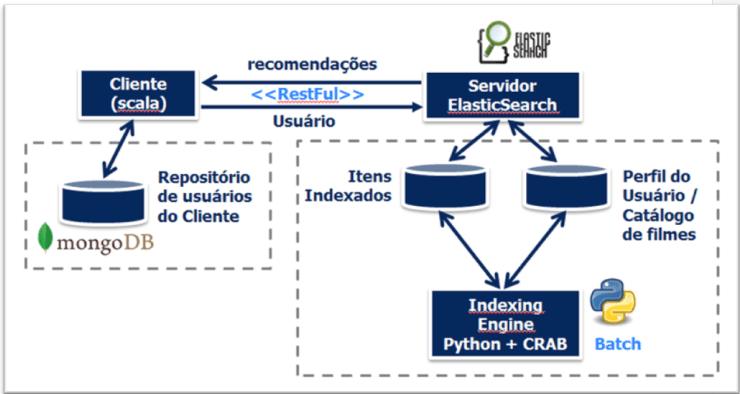 A base de dados em elasticSearch é previamente populada por um processo batch que executa a engine de recomendação em Python com o framework de recomendação CRAB.