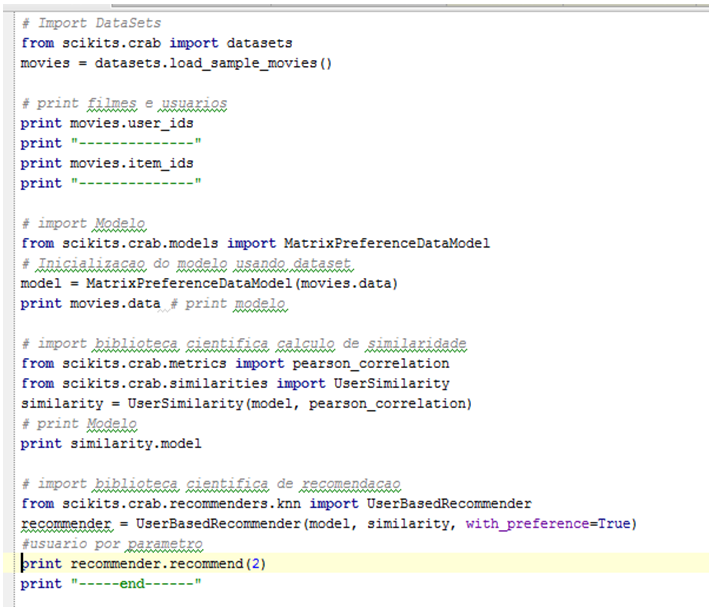Você pode baixar o projeto (aqui) e executá-lo em uma IDE Python (usei o PyCharm). Com o projeto montado, deve-se estudar a estrutura e organização do framework para localizar o diretório que contem os datasets utilizados (scikits\crab\datasets\data), após analisar/alterar a fonte de dados, crie seu “.py” principal que será responsável por executar as chamadas da Biblioteca CRAB. Um exemplo do arquivo pode ser visto abaixo: