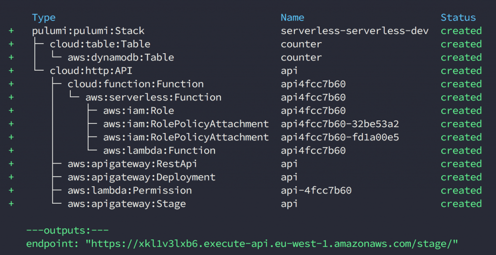 En fonction du provider choisi, new cloud.Table pourra donc être déployée en tant que table AWS DynamoDB, Table Storage sur Azure ou encore DataStore sur GCP. Pour l’instant, la bibliothèque @pulumi/cloud  supporte AWS et Azure, le support pour GCP devrait être ajouté prochainement. Pour l’exemple nous utiliserons la valeur aws pour le paramètre cloud:provider, la table sera donc une table DynamoDB, l’API viendra du service API Gateway et les fonctions (FaaS) reliées à l’API du service AWS Lambda.