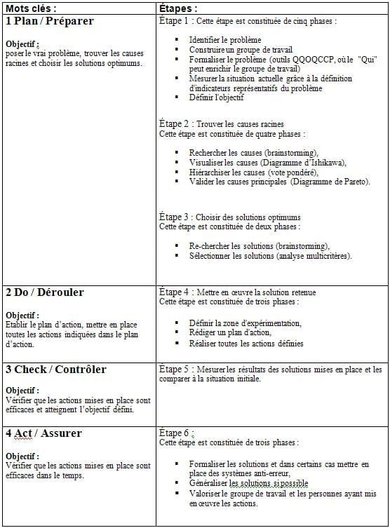 C’est la première lettre des 4 étapes de la méthode. Elles forment un cycle qui se répète à chaque amélioration : PLAN – DO – CHECK – ACT.