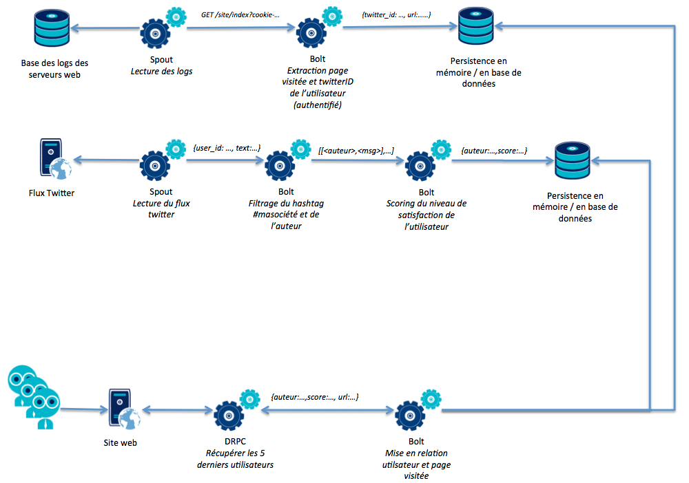Ne sont pas de même nature, n'ont pas la même fréquence d'émission ni le même volume de données. Ce sont donc deux spouts qui s'y connectent, en lisent le contenu à une fréquence adaptée à chaque source de donnée et envoient chacun sur la topologie un stream contenant les informations utiles aux analyses que l'on souhaite effectuer.